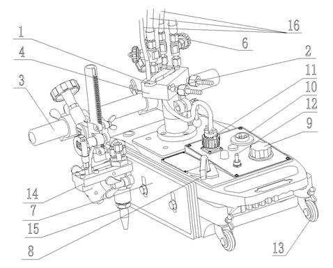 1.點火手柄: 按下該手柄將噴出引導火焰點然割嘴,松開手柄 引導火焰自動熄滅。 |