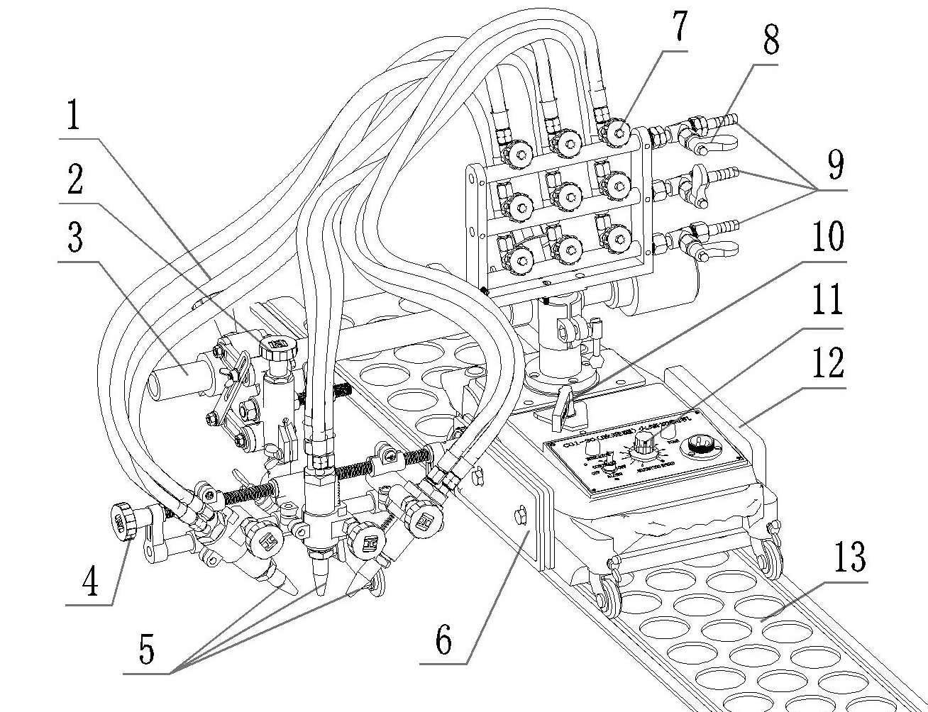 1.輸送氣體的軟管:一共三套,分別為燃氣、 預熱氧和切割氧 2.移動體升降手輪:調節三組割炬與鋼板的高度 3.橫移齒條 4.兩邊割炬水平調節手輪 5.割嘴 6.隔熱板:阻隔因切割產生的熱量擴散到機器內 7.燃氣二通閥:調節氣體流量的大小 |