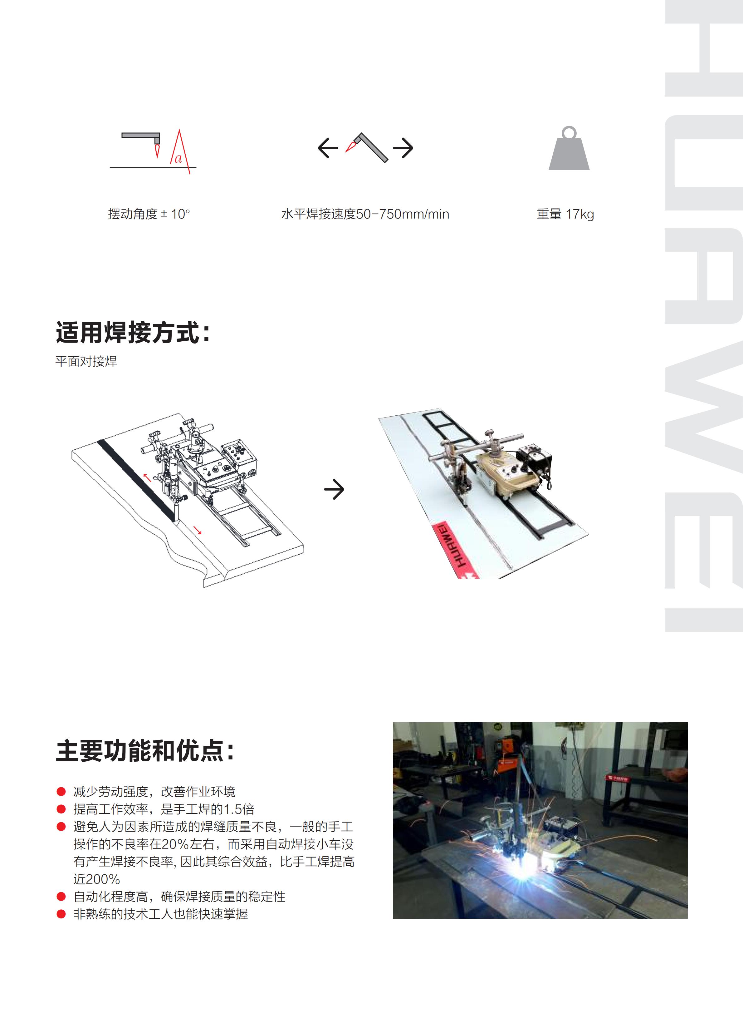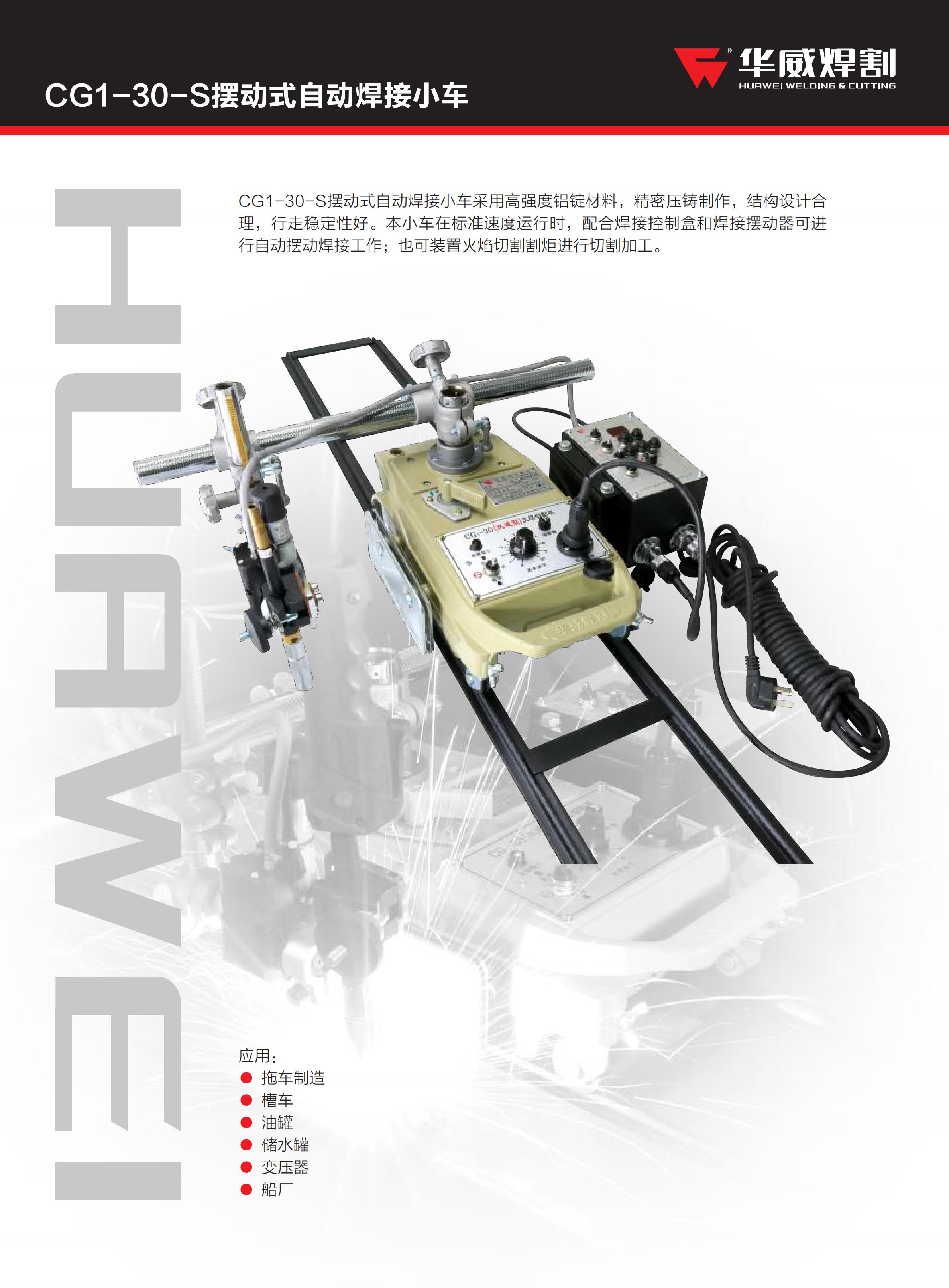 CG1-30-S擺動式自動焊接小車采用高強度鋁錠材料,精密壓鑄制作,結(jié)構(gòu)設(shè)計合理,行走穩(wěn)定性好。本小車在標(biāo)準(zhǔn)速度運行時,配合焊接控制盒和焊接擺動器可進行自動擺動焊接工作;也可裝置火焰切割割炬進行切割加工。