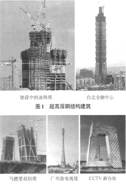 超高層建筑是人類征服自然,不斷取得進步的重要標志,是現代科學技術發展的結晶,也是一個國家科技發展水平和綜合實力的集中體現之一。因此無論是發達國家,還是發展中國家都把興建超高層建筑作為展示社會發展成就的重要手段。而超高層建筑通常采用鋼結構作為主要構成部分,因此超高層建筑一般都是超高層鋼結構。現代超高層建筑起源于美國,已有110年的發展歷史,超高層建筑的興建不但具有顯著的經濟效益和社會效益,能夠展現一個時代、~個國家的科技發展成就,而且可以極大地促進相關領域科技的發展。因此目前興起了超高層建筑建設的新高潮。不僅高度越來越高,如高達492m的上海環球金融中心,508m的臺北國際金融中心,阿聯酋超過700m高的Burj Dubai大廈(迪拜塔),圖l。而且超高層建筑造型也更加多樣化,扭轉的廣州新電視塔和傾斜的中央電視臺新臺址建設工程就是其中典型的代表。