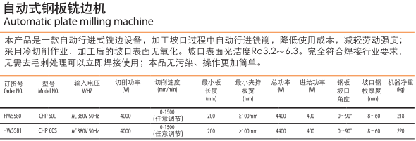 本產(chǎn)品是一款自動行進式銑邊設(shè)備,加工坡口過程中自動行進銑削,降低使用成本,減輕勞動強度:采用冷切削作業(yè),加工后的坡口表面無氧化。坡口表面光潔度Ra3.2—6.3.完全符合焊接行業(yè)要求,無需去毛刺處理可以立即焊接使用:本品無污染,操作更加簡單。