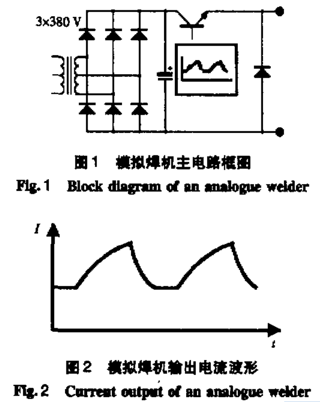 在焊接電源中,變壓器的作用非常關鍵,它一方面滿足電流、電壓的匹配要求,另一方面對送電回路和焊接回路起到電氣隔離的作用。同時,變壓器在能量傳輸回路中的位置決定了焊接電源的體積和質量。圖1為模擬式焊機的主電路框圖。這種電源由一個工頻變壓器、三相整流橋和一個晶體管組組成,晶體管組在回路中的作用相當于負載的串聯電阻。晶體管組工作在放大區.焊接中不需要的電壓消耗在晶體管組的c、E極之間,因此功耗極大,晶體管組需要水冷。模擬焊機的輸出波形如圖2所示。這種焊機的優點是響應速度快,缺點是晶體管組的能耗大,因此基本上已經被其它類型的電源所取代。