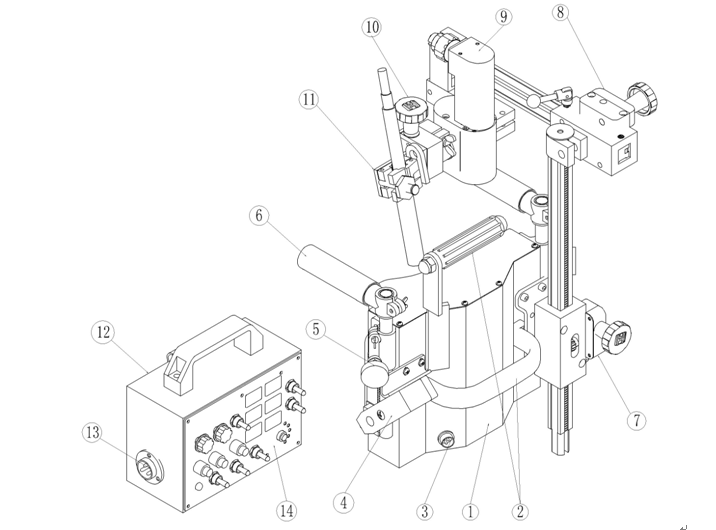 10)角度微調(diào)裝置:此裝置可以很方便地對焊槍的焊接角度進行調(diào)節(jié)。