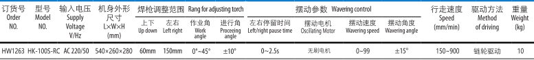 該機(jī)具有擺動(dòng)功能,有不同規(guī)格的焊道方式可供選擇,以獲得最佳的焊接效果。擺動(dòng)速度,擺動(dòng)角度,中心偏移位置和左右停留時(shí)間均可方便的調(diào)整,數(shù)碼管顯示各種調(diào)整數(shù)據(jù)。較寬的軌道讓整臺(tái)機(jī)器的重心更穩(wěn)定,軌道下裝有帶開關(guān)的永磁磁鐵,安裝移動(dòng)更方便。驅(qū)動(dòng)部分安裝了手動(dòng)離合裝置,方便機(jī)器在軌道上快速定位,導(dǎo)輪也配有離合裝置,可以很方便的進(jìn)行小車與導(dǎo)軌之間安裝與拆卸??梢赃M(jìn)行垂直角焊和水平角焊,適用于加強(qiáng)件等的交叉部位的焊接。焊接不銹鋼或鋁材,可選用真空吸盤導(dǎo)軌。無(wú)線遙控操作更加省心省力,注:標(biāo)配二根長(zhǎng)度為2米的柔性導(dǎo)軌。