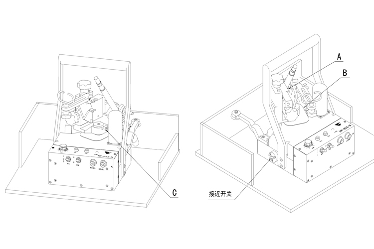在使用過程中,焊槍的行走軌跡近乎是一條直線,如果出現焊槍軌跡過于偏離焊道,將上圖中夾持器的螺絲C松開,將移動座平面A與防塵塊的邊B調整到平行線再旋緊螺絲C即可。