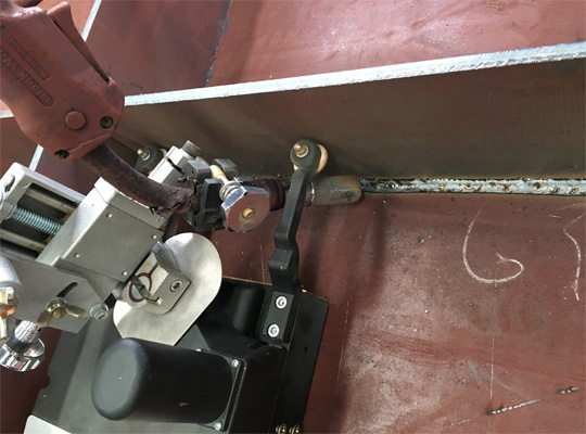本裝置的左側裝有感應式傳感器,當機器行走過程中,傳感器感應到金屬物品時,機器會自動停止,并根據機器的設置自動執行后面的操作(如盲區焊接、收弧、熄弧、復位等動作)。因此一人可同時操作多臺本焊接小車,以提高工作效率。本裝置有三種盲區焊接模式供用戶選擇,可選擇焊槍自動移動到小車的中部、另一側或不動進行焊接;焊接至工件端部時,傳感器自動控制焊槍的輔助行走,執行盲區的焊接。盲區焊接時的焊槍移動速度與小車行走時的焊接速度基本一致,從而不影響焊接質量。