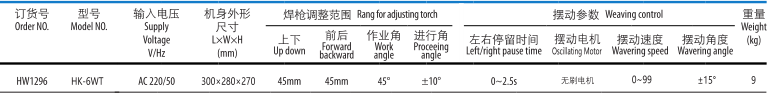 HK-6WT 擺動焊角焊小車一體化機身,堅固耐用,輕巧便攜。低重心設計,小車具有16kg拖力,能夠穩定爬行。設有磁控手柄,移動手柄時可以減少部分磁吸力。容易安裝。可以左右兩方向焊接,小車兩端均安裝有感應開關,焊接結束后小車可以自動停止。具有收弧功能,提高收弧處的焊縫質量。該機具有擺動功能,有不同規格的焊道方式可供選擇。擺動幅度,擺動角度,中心偏移位置和左右停留時間, 均可數字輸入。數碼管顯示各種調整數據,大大縮短設置時間。 擺動模式可供選擇。