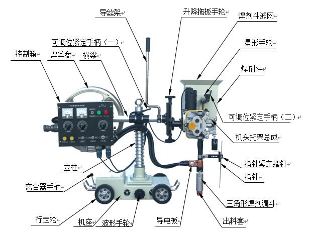 HMZ-1000自動埋弧焊送絲小車與埋弧焊電源組成“自動埋弧焊機”可適用于各種中,厚鋼板的對接,搭接,角焊等焊縫,可焊接的鋼板包括碳素結構鋼,低合金鋼,耐熱鋼等。