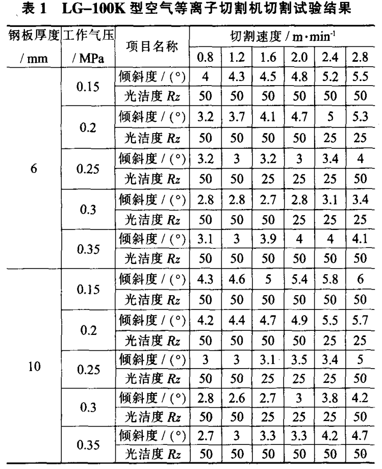 用LG.100K型空氣等離子切割機切割6 mm和10 mm兩種不同厚度鋼板的試驗結果如表1所示。由于試驗數據太多.用該機切割其它厚度鋼板的試驗數據.以及用LG—120K、LG一160K、LG。200K型機切割的試驗數據就不一一列出。在下面將用圖示的方式表達出來。
