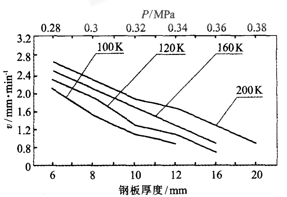從表1結果可看出,當切割速度過高、氣壓過低時,切割面的傾斜度大。這是因為速度過快,弧柱嚴重后傾,割縫下半部熔化速度跟不上。所以切割的零件上平面尺寸小。下平面尺寸大,尤其是切割直角形的零件時.在拐角處的底部割縫成圓弧形而不是直角形。如果切割速度過低、氣壓過高則掛渣嚴重,不易清除,光潔度較差。如果切割速度合適,工作氣壓過高,弧柱的挺度和圓滑度受到破壞,切割能力下降.切割光潔度差。所以,切割不同厚度的鋼板,需要合理地選擇不同的切割功率、切割速度和工作氣壓,才能得到最佳的切割效果。從表1數據還可看出,不同的鋼板厚度有不同的最佳切割速度和工作氣壓。我們根據四種不同型號機型的試驗數據進行分析和整理,繪制出了用不同功率的等離子切割機切割不同厚度鋼板的最佳切割速度與工作氣壓參數曲線圖,如圖1所示。